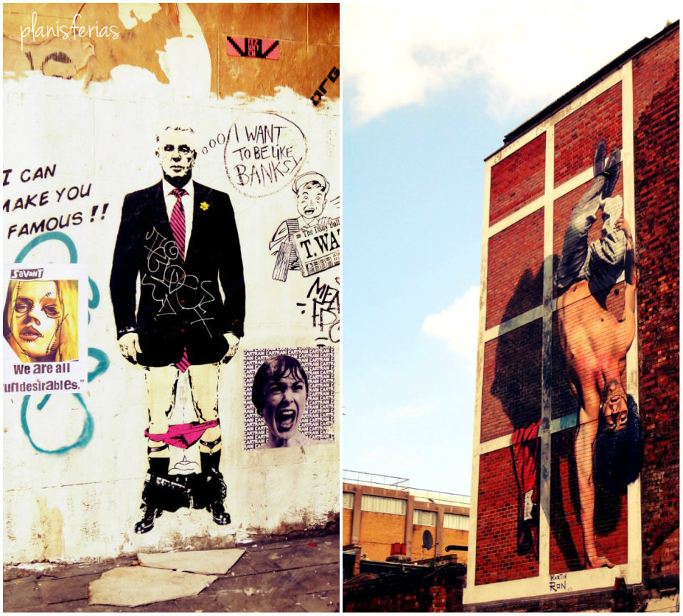 El East End es arte callejero. Las paredes están repletas: stencils, graffitis, murales. Todos conviven, no sin tensiones. Si el arte callejero es en gran parte asociado a la crítica social y política, a una expresión antisistema que interviene el espacio público con el fin de atraer la atención de los transeúntes, lo cierto es que hay artistas más institucionalmente aceptados que otros -lo quieran o no-. Entre ellos, Banksy y Shephard Fairey. El primero, por el privilegio de aceptación que goza con respecto a sus obras, las cuales son protegidas, y criticado por otros artistas del rubro por promover un mensaje anticapitalista cuando simultáneamente trabaja para empresas como Puma o MTV. El segundo, Shephard Fairey, blanco de críticas similares, reconocido por haber realizado el famoso poster de Barack Obama con la leyenda “Hope” que fue utilizado por el actual presidente de Estados Unidos durante su campaña.